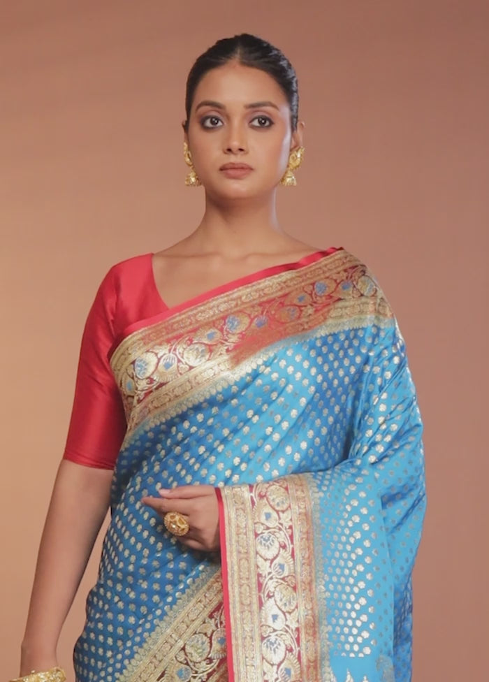 Banarasi Silk sarees, renowned for their luxurious silk, intricate designs and opulence, originating from varanasi, bear royal significance. These sarees feature elaborate motifs inspired from Mughal motifs crafted with zari and often use kadhua or brocade technique. An essential part of every bridal trousseau, banarasi sarees expresses rich cultural significance.