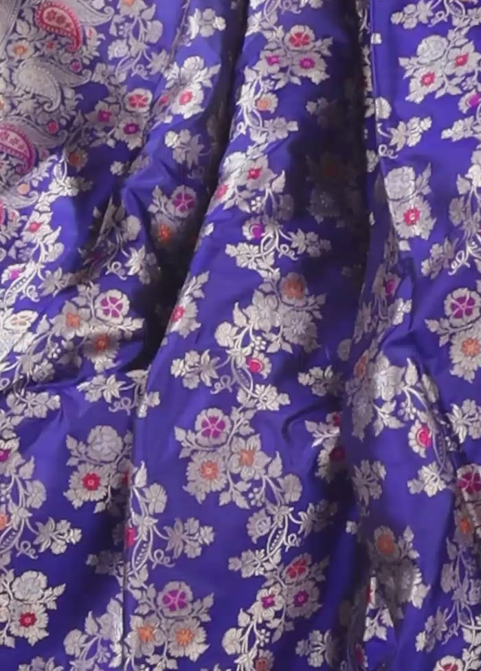 Crafted in the timeless tradition of fine Indian weaving, this exquisite Blue Katan pure silk saree is a true bridal luxury masterpiece. Every inch of the fabric reflects the dedication of skilled artisans, who meticulously handloomed its rich texture and intricate zari motifs over several months. The luminous golden detailing, paired with the deep, royal blue, creates a breathtaking harmony that captures the essence of grand bridal couture.