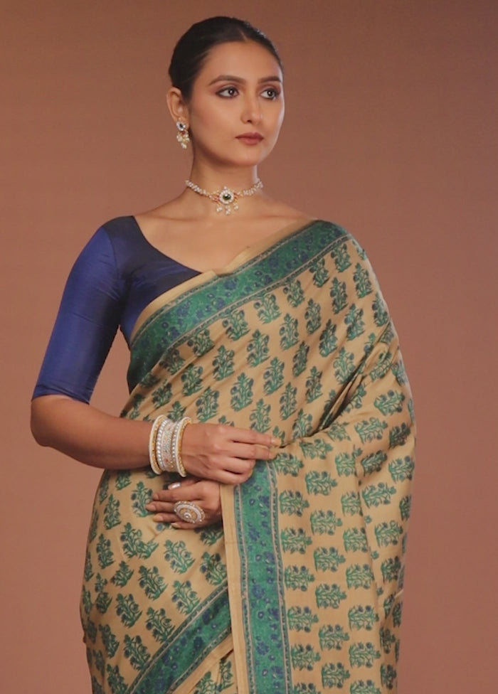 Elegance is when the inside is as beautiful as the outside Presenting, this cream color handloom printed silk saree, made with pure silk fabric which will give you a comfortable yet attractive look. The best part of this saree is its prnt. Pair with a matching blouse piece. Add some matching accessories to complete your look.