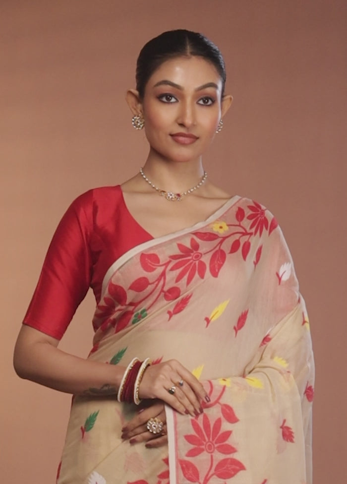 Jamdani weaving, originating from Bengal, which includes present-day Bangladesh and West Bengal, India. This intricate weaving technique is renowned for its fine muslin fabric and delicate floral or geometric designs, woven directly into the fabric. The term Jamdani is derived from the Persian words Jam flower and Dani vase, reflecting the floral motifs and patterns commonly found in Jamdani sarees. These motifs are intricately woven into the fabric using a supplementary weft technique, where additional threads are introduced during the weaving process to create the design.