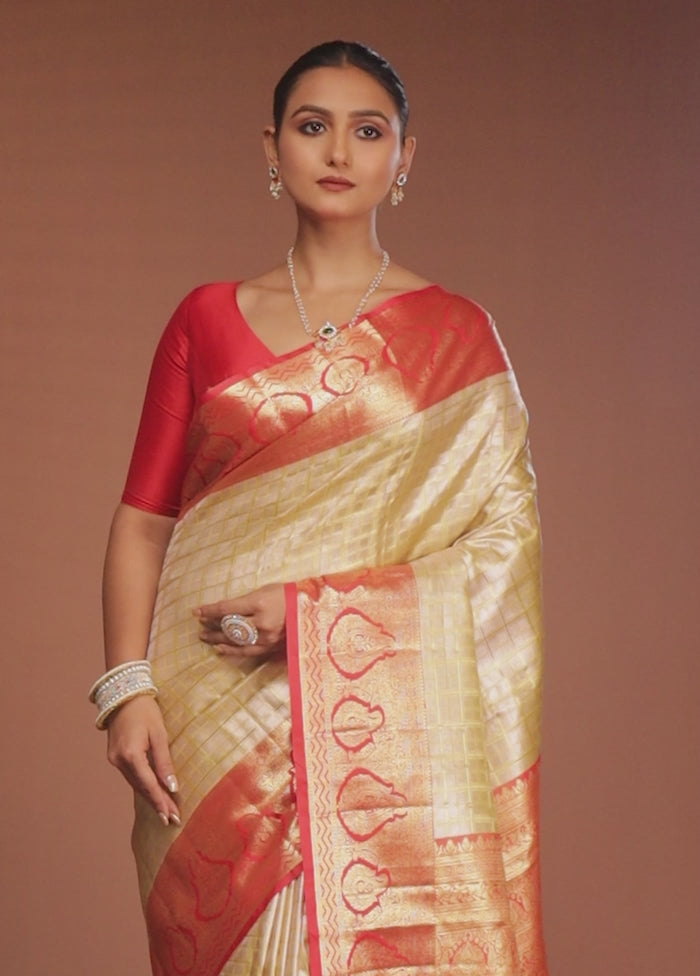 Kanjivaram sarees are considered a symbol of South Indian culture and are highly sought after for weddings, festivals, and other special occasions. The timeless beauty and craftsmanship of Kanjivaram lies in its traditional motifs across the saree, the border and throughout the pallu. These sarees have elaborate designs often depicting mythological stories, peacocks, elephants and many more.