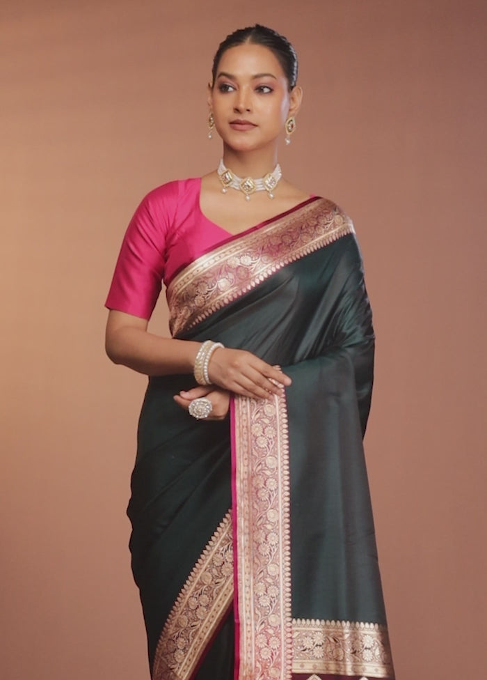 Banarasi Silk sarees, renowned for their luxurious silk, intricate designs and opulence, originating from varanasi, bear royal significance. These sarees feature elaborate motifs inspired from Mughal motifs crafted with zari and often use kadhua or brocade technique. An essential part of every bridal trousseau, banarasi sarees expresses rich cultural significance.