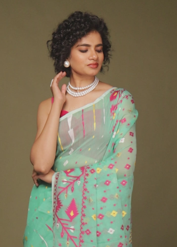 Jamdani weaving, originating from Bengal, which includes present-day Bangladesh and West Bengal, India. This intricate weaving technique is renowned for its fine muslin fabric and delicate floral or geometric designs, woven directly into the fabric. The term Jamdani is derived from the Persian words Jam flower and Dani vase, reflecting the floral motifs and patterns commonly found in Jamdani sarees. These motifs are intricately woven into the fabric using a supplementary weft technique, where additional threads are introduced during the weaving process to create the design.