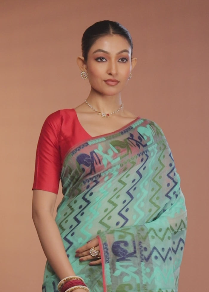 Jamdani weaving, originating from Bengal, which includes present-day Bangladesh and West Bengal, India. This intricate weaving technique is renowned for its fine muslin fabric and delicate floral or geometric designs, woven directly into the fabric. The term Jamdani is derived from the Persian words Jam flower and Dani vase, reflecting the floral motifs and patterns commonly found in Jamdani sarees. These motifs are intricately woven into the fabric using a supplementary weft technique, where additional threads are introduced during the weaving process to create the design.