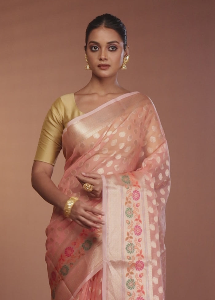 Organza sarees are in style for their sheer elegance and lightweight texture. Made from kora silk, organza sarees have a sheer finish, embrodiered or printed patterns and gives a airy, breezy, easy to carry feel. Ideal for day weddings and parties, Organza sarees are a must have in your wardrobe.